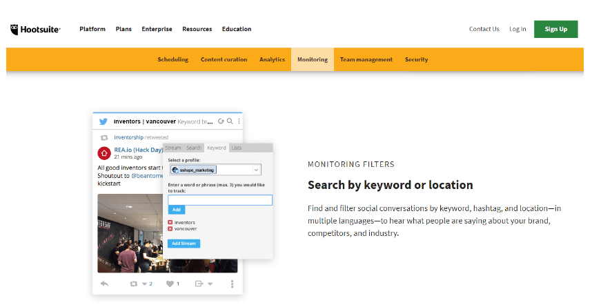You can easily track social media reviews through Hootsuite’s free service. If you’re just looking to keep an eye on basic customer engagement, Hootsuite allows you to monitor up to 3 social media profiles, with the added bonus of scheduling up to 30 shares. If you need to track more profiles (up to 10) or want access to unlimited message monitoring, it’s easy to upgrade your account without losing any of your current information or metrics. This enables you to stay on top of the pulse of your customers’ needs, ensuring you’re one step ahead of concerning public reviews.